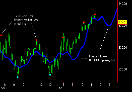 They say a picture is worth a thousand words. Take a look at the chart above. Using only two of the techniques in the Wave59 RT charting package, users were able to pinpoint all of the turning points in the mini S&P with high accuracy. The red and blue dots appeared in real time, indicating when a particular swing had exhausted itself, and the blue forecast indicated exactly what the price swings would look like. This blue forecast line was plotted before the opening bell, providing a road map for the entire day. As you can see on the chart above, it says the market will drop for an hour, then rally into the close. Go check your charts to see what actually happened after this screen capture was taken!